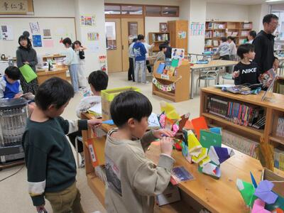 11月25日(火)~28日(金)までの一週間限定で図書委員会主催の「図書まつり」が開催されました。期間中に図書室を訪れ、本を借りた人には折り紙作品のプレゼントがあり、さらに3日間訪れた人には特製メダルが授与される工夫がされていました。多くの人が訪れ、図書室は大盛況となりました。