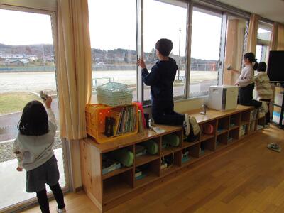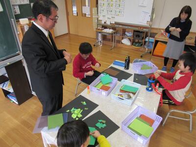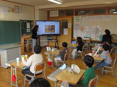 12月12日(金)、1年生と大原保育園のすみれ組の子供たちとの交流会が行われました。1年生は、音楽科で学習した「とんくるりん ぱんくるりん」の合奏を披露した後、じゃんけん列車やいす取りゲーム、生活科で自分たちで工夫して作ったけん玉などのおもちゃですみれ組の子供たちと遊びました。