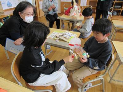 最後には、「お家の人や1年生に見せたい」「使い方を教えたい」「いつも捨てているものでおもちゃが作れると気づいた」「お家でも作って遊びたい」といった意欲的な声が聞かれ、活動を通じて学んだことを日常生活に生かそうとする姿が印象的でした。