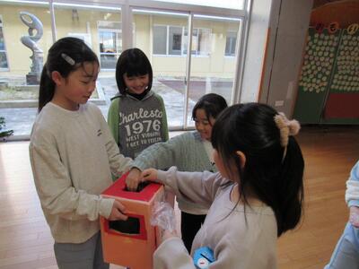 児童会執行部が、朝の昇降口で赤い羽根共同募金を呼びかけています。募金してくれた人には「ありがとうございます」と心を込めて感謝の気持ちを伝えています。