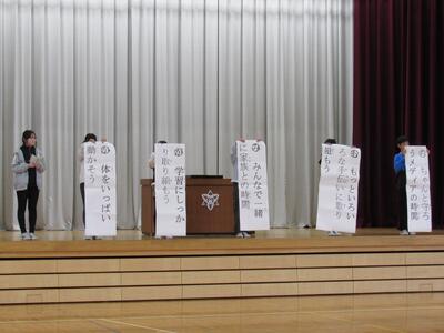 12月10日(火)に児童集会を行いました。執行部から、冬休みのめあてが話されました。合言葉は、「かがみもち」です。