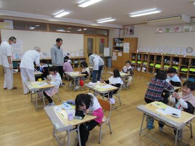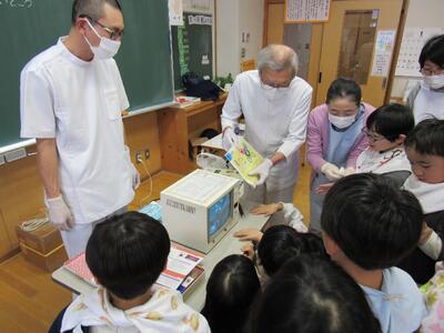1月19日(月)、1年生が染め出し液を使って、歯垢を確認する体験をしました。歯垢を画像で見たり、歯が染まっているところを鏡で見たりし、子供たちは歯の汚れに驚いていました。奥歯や隙間に汚れが溜まりやすいことを学び、正しい歯みがきの方法も学びました。