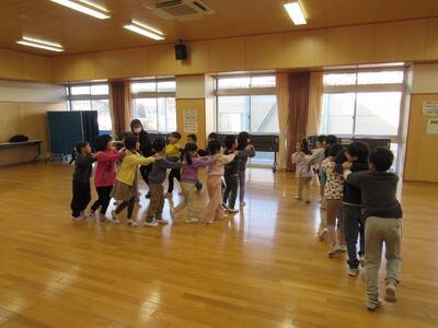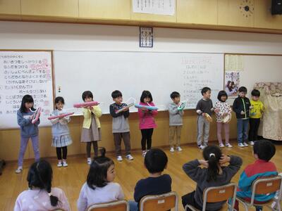 12月12日(金)、1年生と大原保育園のすみれ組の子供たちとの交流会が行われました。1年生は、音楽科で学習した「とんくるりん ぱんくるりん」の合奏を披露した後、じゃんけん列車やいす取りゲーム、生活科で自分たちで工夫して作ったけん玉などのおもちゃですみれ組の子供たちと遊びました。