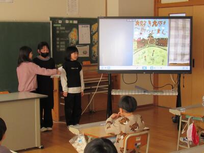 2月18日(水)、2年生と3年生が交流する活動が行われました。3年生は総合的な学習の時間に取り組んできた「大原のまち」のことについて、紙芝居やクイズ、絵本を自分たちで作り、2年生に紹介しました。2年生は熱心に耳を傾けながら、地域への理解を深めたり来年度の学習内容に興味を持ったりしました。